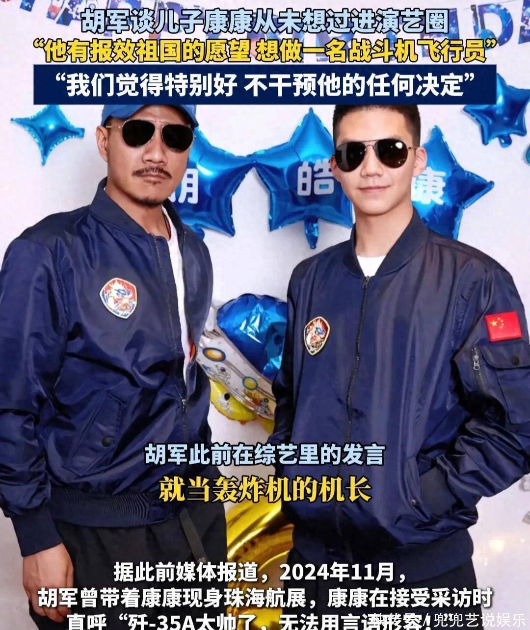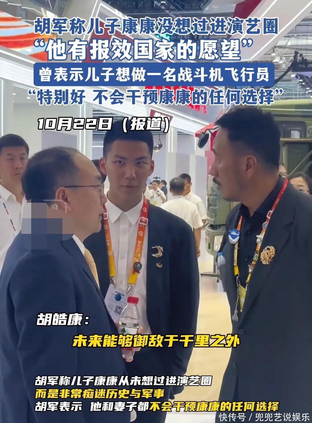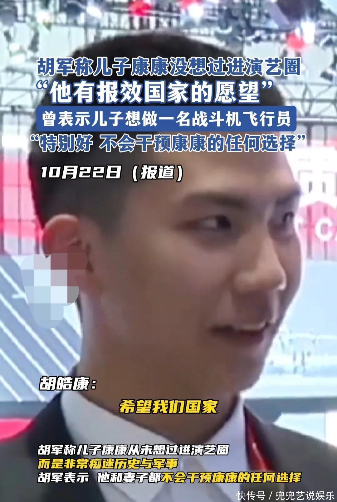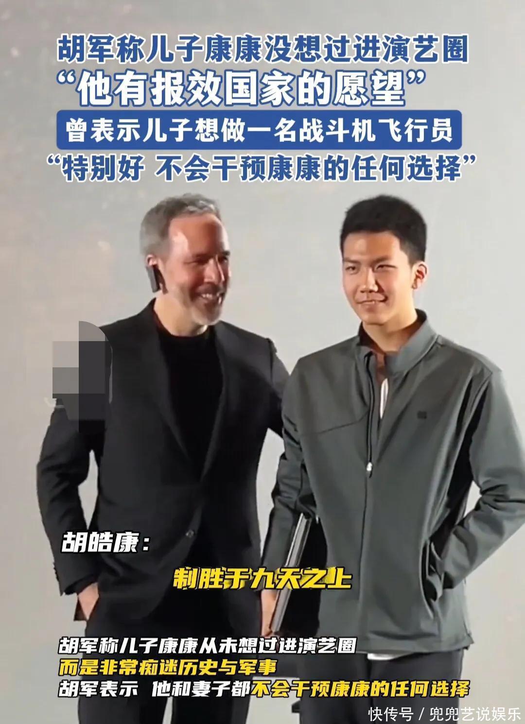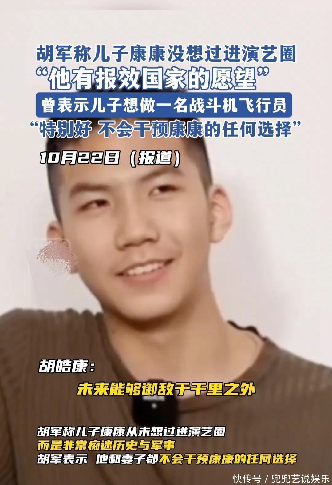 胡军曾表示:儿子康康没想过进演艺圈,他的志向是想做一名战斗机飞行员,他有报效祖国的愿望。